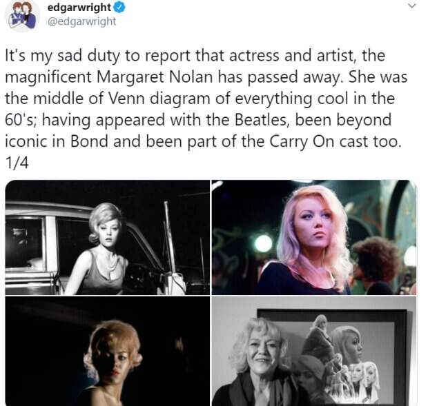 Она являлась воплощением всего крутого, что было в 1960-е: от роли массажистки Динк в бондиане до появления в фильме "Вечер трудного дня" вместе с The Beatle. Я работал с ней в прошлом году. Она была очень веселой и умной, и, как вы можете догадаться, у нее было много удивительных историй. Я рад, что знал ее", – написал он, отметив, что фанаты безутешны. Маргарет Нолан стала широко известна по роли массажистки Динк из третьего фильма про Джеймса Бонда "Голдфингер". В фильмографии актрисы около трех десятков ролей в полнометражных фильмах и множество появлений на телевидении. Актриса снялась с Beatles в фильме "Ночь после тяжелого дня", снялась в фильмах "Нет секса, пожалуйста, мы британцы", "Великий инквизитор", в сериале "Возвращение в Брайдсхед" и других. Последней работой Маргарет в кино является триллер "Прошлой ночью в Сохо", который выйдет на экраны в 2021 году. Напомним, злой рок сериала "Хор" выбрал новую жертву: что известно о таинственной гибели Наи Риверы. Как сообщала Politeka, проклятье сериала «Мастер Маргарита» в действии: не стало известной актрисы, подробности. Также Politeka писала, что Джон Траволта вслед за сыном потерял красавицу-жену, новая беда добьет звезду.