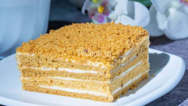 Отличный рецепт приготовления нежного и ароматного торта с прослойкой из сметанного крема, который обязательно понравится многим и приятно удивит своими великолепными вкусовыми качествами! Ингредиенты На рецепт приготовления: Мед 100 гр. Сода пищевая 1 ч.л. Сливочное масло 120 гр. Куриные яйца 4 шт. Соль 0,25 ч.