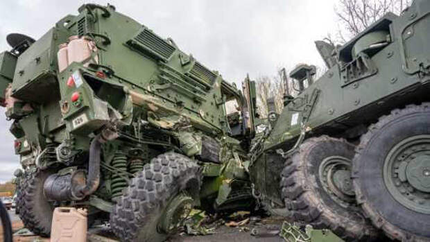 Потери НАТО растут: в Германии врезались американские MRAP MaxxPro и новейший самоходный ЗРПК M-SHORAD на базе БТР Stryker A1.