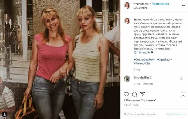 На снимке совсем юная Ольга предстала в полосатой маечке и светлых джинсах. На плечике у блондинки - модная по тем временам сумочка. Мать Ольги выглядела счастливо, женщина улыбалась и нежно смотрела в камеру. «Моя мама, когда у меня уже появилось декольте, запрещала мне скакать на скакалке, и говорила, что это очень неприлично, когда груди трясутся. Представляете, как меня воспитывали? На дискотеках, когда другие танцевали, я думала: «Боже, какие глупые танцы» и стояла себе у батареи никому не нужная», - процитировали Ольгу авторы поста. За неделю пост собрал почти 300 лайков и много комментариев: "Вы очень красивая,душевная и мудрая. Хотя мои дочери говорят,что я тоже их очень строго воспитывала.