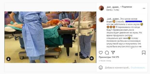 Девушка регулярно публикует фото и видео после прилета, показывая весь процесс. Этот раз не стал исключением. Девушка уже лежала на операционном столе, а вокруг работали врачи. Анастасия была без одежды и измазана чем-то.  "Это самое милое видео. Так заботились о моих скулах. Я переживала,что когда будут переворачивать вниз лицом,будет давление на скулы. Но врачи придумали систему специально для меня", - написала звезда под видео. Фанаты посмотрели более 100 тысяч лайков и написали комментарии: "Rip queen", "Милее не видела", "Трупом лежишь", "В Стамбуле дешевле что ли все делать?", "Да, молодцы, что так продумывают". Мы писали, что известная модель и блогер Анастасия Покрещук которая известна своими нарощенными скулами снова шокировала публикку. В очередном посте Покрещук рассказала, что сделала себе липосакцию.  Напомним, звезда "Від пацанки до панянки" Покрещук после наркоза рассказала, где себя подрихтовала А еще Politeka сообщала, что звезда "Від пацанки до панянки" Покрещук раскинула ноги в непристойной позе Также Politeka писала, что звезда "Від пацанки до панянки" Покрещук попала в руки врачей, видео не для слабонервных