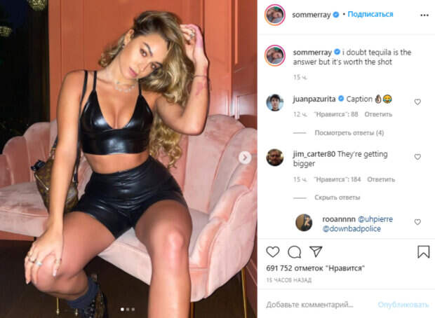 Девушка втиснулась в кожаный топ со "вкусным" декольте и шортики. Блондинка распустила волосы, нанесла яркий макияж и покрутилась перед камерой, кокетливо стреляя глазками. Сочными и упругими формами Соммер невозможно налюбоваться. На некоторых кадрах Рей дерзко расставила ножки, оперевшись руками о колени. "я сомневаюсь, что текила - это ответ, но оно того стоит", - подписала кадры модель. Пользователи с восторгом кинулись обсуждать увиденное, не жалея комплиментов в комментариях: "Подпись