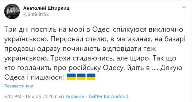 Офицер ВСУ Анатолий Штефан рассказал рассказал, как относятся в Одессе к украинскому языку Штефан проводит отпуск на море в Одессе и часто общается с местными жителями на украинском языке, об этом он сообщил в Twitter, передает Politeka.net. В ответ русскоязычные украинцы начинают говорить с ним на украинском языке.