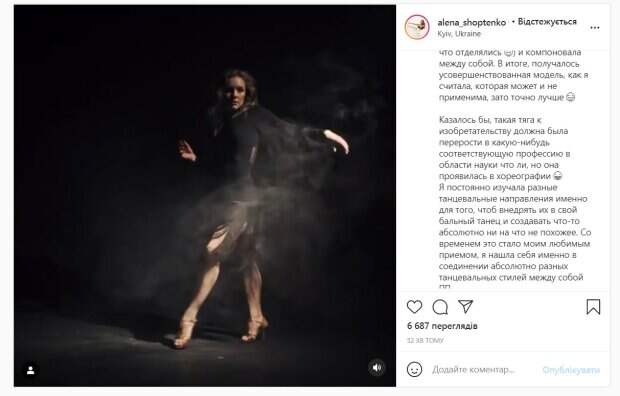 Она танцевала в соблазнительном черном платье с длинной бахромой и прозрачными вставками. Видео было снято в полумраке и дыме. Алена Шоптенко рассказала, что особенность, которая сейчас помогает делать ошеломительные танцы, появилась у нее еще в детстве. «В детстве у меня была любимая игра. Я брала любые 2 вещи, разбирала их, брала, как мне казалось, лучшие их части (ну или те, что отделялись