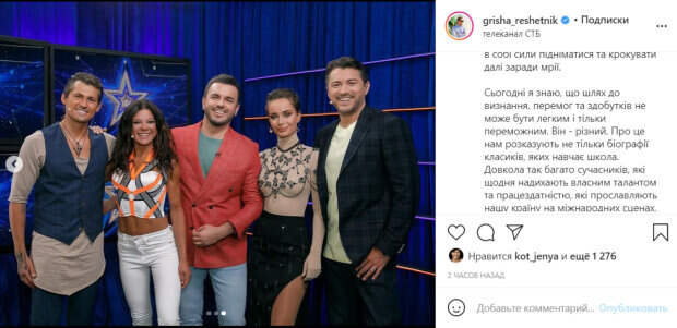 На этот раз телеведущий поделился новой публикацией на своей странице в Инстаграм. Он показал себя с людьми, которыми гордится и рассказал, как сам достиг успеха. "В сентябре далекого 2002-го года я из Николаева только перебрался в столицу, чтобы воплотить свою заветную мечту - стать телеведущим и вести популярные проекты страны. Эти 19 лет были далеко не сладкими, а порой и очень сложными, в первую очередь - морально. Очень часто после проигранных важных кастингов опускались руки, хотелось все бросить и вернуться в родительский дома, где тебя приласкают и успокоят. Но вера родителей, хоть и на расстоянии, и вера преподавателей в мой талант и возможности, не давали этого сделать. Поэтому я вновь и вновь находил в себе силы подниматься и шагать дальше ради мечты. Сегодня я знаю, что путь к признанию, победам и достижениям не может быть легким и только победным. Он - разный. Об этом нам рассказывают не только биографии классиков, которых учит школа. Вокруг так много современников, ежедневно вдохновляют собственным талантом и работоспособностью, которые прославляют нашу страну на международных сценах, стадионах, общественных аренах...Я хочу поддержать крутую инициативу Сергея Притулы и выделить современников, талантом которых восхищаюсь и горжусь лично. Жан Беленюк, Ольга Харлан, Руслана, вы такие разные, но каждый из вас для меня - лучший в своей сфере. Вы - пример того, как важно ежедневно верить в свой успех, подниматься чаще, чем падать. И, конечно, мечтать. Ваши невероятные истории, доказывают, что возможно все. Рад, что имею честь знать вас лично А кем из современников гордитесь Вы?", спросил Григорий Решетник. Ранее сообщалось, Решетник перед стартом "Холостячки" с Огневич взбудоражил украинцев кадрами: "Ой что будет..." Также, Решетник накануне премьеры "Холостячки" со Златой Огневич раскрыл интересные подробности о женихах: "Все потеряли голову" Politeka рассказывала, жена ведущего "Україна має талант" Решетника пожаловалась на "провальное" утро с мужем: "Ох, сейчас покажу..."
