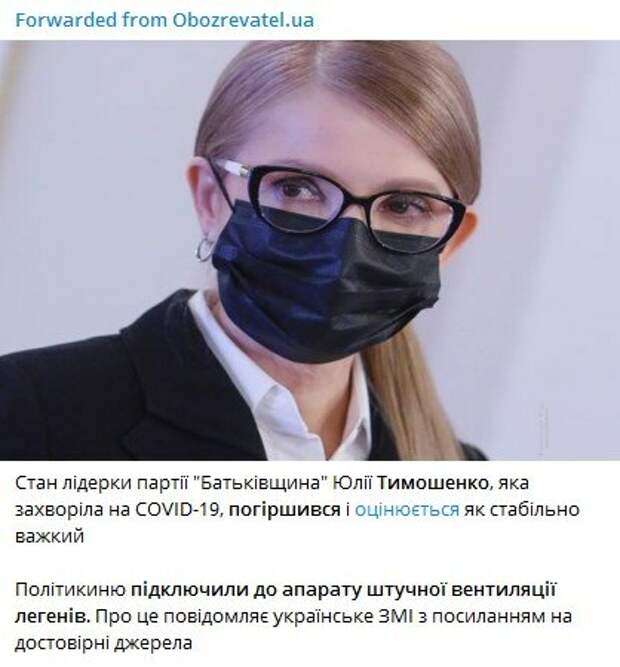 Состояние больной китайским вирусом лидера партии «Батькивщина» Юлии Тимошенко резко ухудшилось Об этом во вторник, 25 августа, пишет "РБК-Украина". Отмечается, что сейчас состояние политика стабильно тяжелое, температура не опускается ниже 39 градусов. Также СМИ со ссылкой на осведомленный источник пишут, что Тимошенко подключили к аппарату искусственной вентиляции легких.