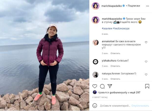 В выходной день телеведущая выбралась на побережье и решила очаровать, а заодно и заинтриговать фанов атмосферным снимком. Маричка позировала в демисезонной куртке бордового цвета и темных спортивных штанах, которые она сочетала с ярко-розовыми кроссовками. Свой прогулочный образ она дополнила кепкой. Звезда была почти не накрашена и улыбалась на камеру. Всем своим видом она напоминала девочку-подростка. «Немного моря Вам в ленту