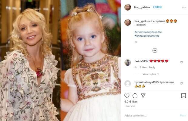 Тайна рождения детей Аллы Пугачевой и Максима Галкина не дает покоя фанатам звездной семьи Как сообщает Politeka.net, в соцсети "Инстаграм" сравнили внешность Елизаветы Галкиной и ее знаменитой сестры Кристины Орбакайте. В одном из фанатских сообществ появилось фото, на котором старшая дочь Примадонны запечатлена в белой блузке с оборками и цветочными узорами, а также с крупным амулетом на золотистой цепочке.