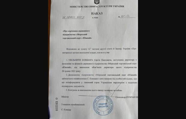 Министр инфраструктуры Александр Кубраков решил уволить Сергея Ковшара из порта "Южный" На МТП "Южный" он исполнял обязанности директора и занимал должность заместителя директора по экономике и финансам. Об этом сообщает РБК-Украина со ссылкой на копию соответствующего решения. Как отмечается в приказе, решение вступает в силу 28 мая 2021 года.