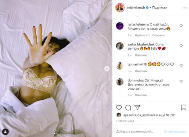 Мишель позировала в белоснежной постели, но слегка примятой. На одном из кадров игривая Андраде, наполовину укутанная в одеяло, вытянула руку вперед, широко расставив пальцы, будто бы прикрываясь ими от объектива. Но камера все равно запечатлела ее улыбку и аппетитное декольте. На другом фото Мишель сладко понежилась и прикинулась будто бы спит - девушка приобняла ножкой одеяло и закрыла глаза. "Я знала, что неделя перед релизом будет очень продуктивной. И мне нужно будет очень быстро передвигаться по всему городу, так что переместилась в центр. В самом сердце Киева❤️ Теперь у меня столько крутых воспоминании связанным с этим местом) PS: на Mirror уже миллион!!!", - говорится в подписи. Пользователи кинулись обсуждать увиденное. Некоторые "записали" подопечную Потапа в следующую "Холостячку", надеясь, что девушка прислушается и отправится на шоу искать свою любовь. "Боже, ты идеальна