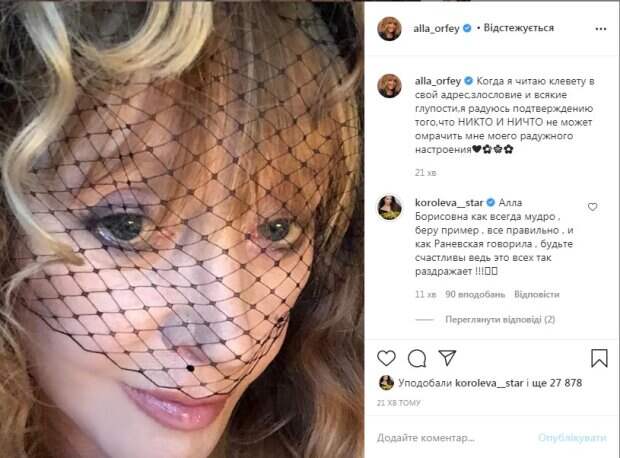 Алла Пугачева не сдержалась после обилия неприятных заявлений в свой адрес Как передает Politeka.net, Примадонна высказалась по этому поводу на своей странице в Инстаграм. Отметим, Пугачева не часто делает посты в Инстаграм, поэтому можно предположить, что на этот раз ее действительно достало. «Когда я читаю клевету в свой адрес, злословие и всякие глупости, я радуюсь подтверждению того, что НИКТО И НИЧТО не может омрачить мне моего радужного настроения❤️