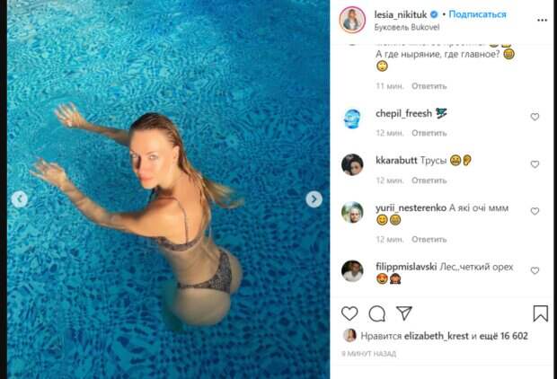 Леся в Instagram опубликовала несколько кадров, сделанных в бассейне отеля. На снимках Никитюк показала очередной купальник из своей коллекции и продемонстрировала свою роскошную фигуру, сменив несколько будоражащих воображение поз. В частности, Леди Ле позировала в леопардовом микро-купальнике прямо посреди бассейна. При этом ведущая пронзительно глядит в объектив и выгодно демонстрирует свои точеные формы. "Аквамен я жду...