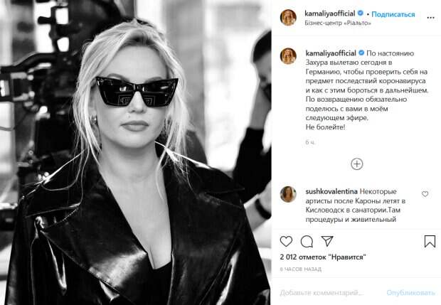 «По настоянию Захура вылетаю сегодня в Германию, чтобы проверить себя на предмет последствий коронавируса и как с этим бороться в дальнейшем. По возвращению обязательно поделюсь с вами в моём следующем эфире. Не болейте!», - написала Камалия. Она также поделилась своим черно-белым снимком. На фото певица позирует в кожаной куртке и блузе с глубоким декольте, а также в больших очках. Поклонники Камалии активно комментируют ее пост. «Красавица! И супруг Ваш молодец, заботливый!», «Хорошей Вам поездки! Берегите себя!», «Шикарная!!! Поскорее возвращайтесь красивыми и здоровыми», «Захур просто золотой муж», «Храни вас бог!», - пишут люди. Ранее Камалия сообщила о том, что они с семьей заразились китайским вирусом, еще 11 сентября. 23 сентября Камалия сама рассказала, о том, как протекает болезнь, у себя в Фейсбук. «Я очень подавлена! Захуру сегодня стало хуже, ездили в Александровскую, КТ показало до 40% поражения лёгких! Сменили антибиотики. Если не станет лучше до пятницы, то госпитализация неизбежна!», - призналась певица. Напомним, беда в семье самой богатой украинской певицы, звезда не сдержалась: «Так выглядеть перед смертью...». Как сообщала Politeka, самая богатая певица Украины встала на колени, удивив неожиданным хобби: "А где муж? ". Также Politeka писала, что самая богатая певица Украины показала, как выглядела до популярности: "С каждым годом все краше".
