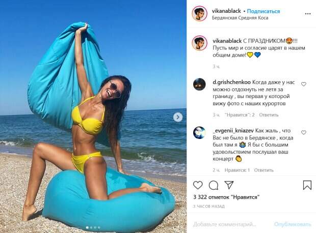 По случаю праздника звезда решила устроить фотосессию в цветах государственного флага. Она выбрала желтый купальник-бикини, который выгодно подчеркнул не только ее идеальную фигуру, но и загорелую кожу. На фотографиях Вика веселиться с двумя голубыми надувными креслами, на которых она забавно позирует развалившись и расставив ноги. «С ПРАЗДНИКОМ!!! Пусть мир и согласие царят в нашем общем доме!», - подписала фото певица. Ее поклонники активно комментируют фото. «Шикарный цвет», «Цвета нашего флага. Погода супер, фигура божественная. С праздником вас!», «Шикарная», «девушка моей мечты. Я люблю твою улыбку», «Как вообще этот наш щедрый, украинский урожай не выпал из сумки на 4-м фото? С Днем Независимости!», «Потрясающе патриотично и очень, очень красиво!», «Фигура нереальная», «С праздником. Виктория красавица, загар фантастический», - пишут люди. Ранее мы писали, что певица поделилась ярким фото с отдыха. На опубликованном снимке Смеюха демонстрирует роскошную фигуру, которую облачила в крохотный купальнике. На заднем фоне виднеется лазурное море. Поклонники красотки буквально «засыпали» ее комплиментами. Напомним, Вика из "НеАнгелов" сверкнула крепким "орешком" на отдыхе, вид впечатляет. Как сообщала Politeka, Смеюха из «НеАнгелов» взбудоражила аппетитными местами в крохотном купальнике. Также Politeka писала, что мокрая Смеюха из «НеАнгелов» соблазнила аппетитными местами в крохотном бикини: «Можно все!».