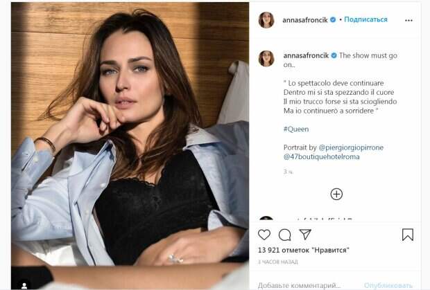 Как оказалось, умерла любимая бабушка Анны, Лида. Девушка жалела, что не смогла дать бабушке заботы, побыть с ней в последние дни. Однако все же в новом посте через боль утраты внучка Чапкиса нашла в себе силы написать, что жизнь продолжается. Красотка опубликовала пост, представ на фото в красивом черном топике, который показала, распахнув голубую рубашку. Снимок Сафрончик подкрепила словами песни группы Queen "The Show Must Go On". "Шоу должно продолжаться... Шоу должно продолжаться Мое сердце разбивается внутри Мой макияж тает Но я продолжу улыбаться", - написала артистка. За три часа пост собрал более 10 тысяч лайков и много комментариев. Пользователи сети поддерживали Анну. Напомним, Анна Сафрончик родилась в семье тенора Евгения Сафрончика и балерины Лилии Чапкис (дочери Григория Николаевича от первого брака). Когда девочке было 13 лет семья эмигрировала в Италию. Девушка стала обладательницей титла «Мисс Тоскана» в 1998 году, а в 2000 исполнила роль в фильме «Добро пожаловать, Албания». Сейчас звезда продолжает сниматься в фильмах и сериалах. Напомним, что появилось фото и новые подробности о состоянии судьи «Танців з зірками» Чапкиса Как сообщала Politeka, Григорий Чапкис рассказал о состоянии после срочной госпитализации, болезнь не отступает: "Голова кружится и. .." Также Politeka писала, что госпитализированный Чапкис раскрыл свой диагноз, ситуация тяжелая: "Теперь лежу в..."