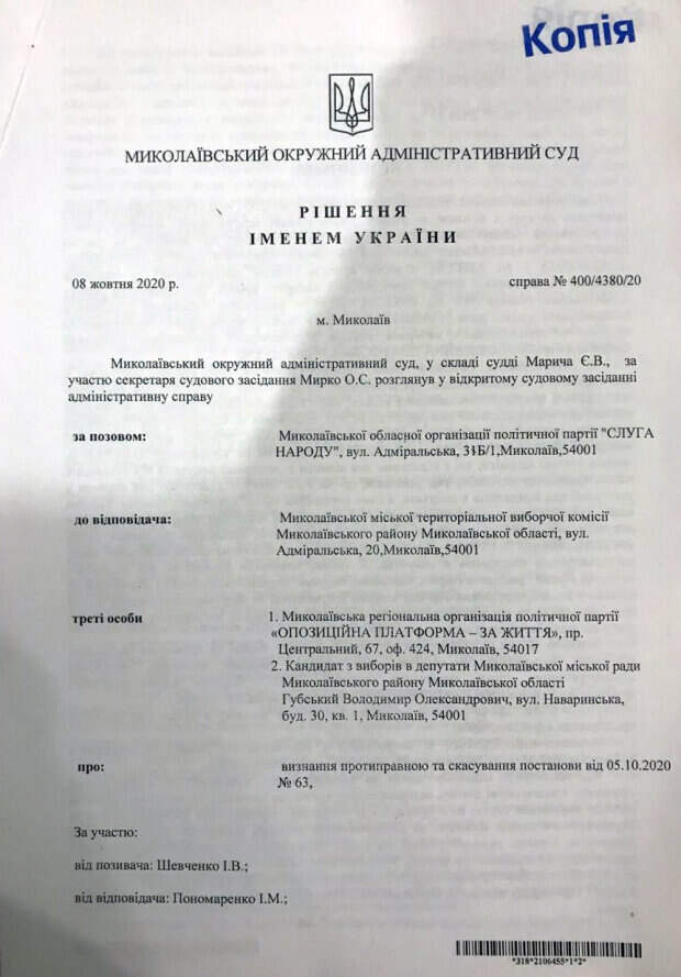 Николаевский суд не позволил «Слуге народа» реализовать план нечистоплотной борьбы с партией «Оппозиционная платформа – За жизнь» на местных выборах Партии власти не удалось снять с выборов в городской совет Николаева своих главных оппонентов, говорится на официальном портале политсилы. Так, представители «Слуги народа» в судебном порядке требовали снять с регистрации кандидатов в депутаты Николаевского городского совета от ОПЗЖ.