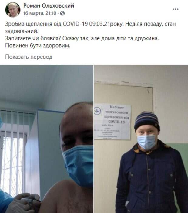 «Сделал прививку от COVID-19 9 марта 2021 года. Неделя позади, состояние удовлетворительное. Спросите, боялся ли? Скажу, да, но дома дети и жена. Обязан быть здоровым», - сообщил Ольховский на своей странице в Фейсбук. Под его постом собралось немало комментариев, где люди пишут, что также хотят вакцинироваться. Одессит Вадим Шпаченко описал первые два дня после того, как укололся CoviShield. «Неприятным был следующий день после вакцинации. Укололся вечером в четверг, а в пятницу собрал все карты - температура до 38.5, озноб, головная боль, утомляемость и вот это вот все. К вечеру пятницы температура начала падать, а самочувствие приходить в норму. В субботу проснулся полон сил, пусть и спал почти десять часов", - отметил он. Еще одна одесситка Елена Ротари сообщила, что спустя сутки после вакцинации она себя чувствовала хорошо, однако ее донимала головная боль. Напомним, что медик ковидной больницы трубит о катастрофе в Одессе: "реанимация похожа на газовую камеру" Как писала Politeka, в Одессе отпустили учеников по домам, но не всех: что нужно сделать, чтобы учиться дистанционно Также Politeka сообщала, что в Одессе снова подскочил прирост новых зараженных коронавирусом: сколько выявлено больных за сутки