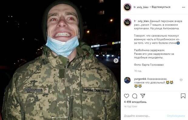 Вскоре подозрительного гражданина обнаружили по адресу ул. Антоновича, 156. «Громилой» оказался военнослужащий, который проживает на территории воинской части в пгт. Коцюбинское. По словам задержанного, он самовольно ушел из части, поскольку у него болела спина. Мужчина без разрешения отправился в больницу, адреса которой патрульным назвать не смог. Отмечается, что при общении с правоохранителями хулиган вел себя вызывающе, четко не мог отвечать на вопросы. Свидетели рассказали, что он повредил во дворе семь автомобилей, большинство из которых сделаны во Франции: поднимал с земли камни и палки и бросал в припаркованные транспортные средства. Парня доставили в Голосеевское УП для дачи объяснений. Позже выяснилось, что перед этим он повредил еще пару авто в Святошинском районе столицы. По информации в соцсетях, ранее этого человека уже задерживали за подобные инциденты. Происшествие вызвало небывалый резонанс, а пользователи оставили немало комментариев. Многие предполагают, что парень был под наркотиками, а также недоумевают, чем ему не угодили французские авто. «Миссию проходил