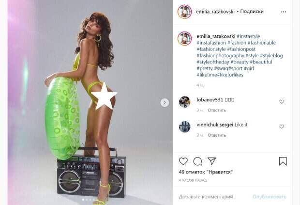 Так модель похвасталась фигурой во время фотосессии в стили 80-х. Жгучая Ратаковски надела разные бикини, сверкая оголенными частями тела. На одном из снимков красотка предстала в салатовом мини-бикини, которое подчеркнуло ее красивую грудь, она выставила упругие ягодицы назад, показывая их во всей красе. Модель сверкала стройными ножками, намазанными лосьоном. Звезда позировала с кругом в руках и магнитофоном на полу. Прическа модели была пышной, которая была в моде в то время. На другом фото стильная красотка позировала в бикини леопардовой расцветки, искусно выгнувшись на стуле. Она сверкнула упругими ягодицами в крохотных бикини. Фото были обнародованы в фан-группе Инстаграм и собрали за четыре часа всего несколько десятков лайков. "Единственная в мире девушка, в которую я влюблен", - написал один из поклонников. Ранее мы писали, что Эмили Ратаковски в 14 лет подписала контракт с агентством Ford Models, после чего ее модельна карьера пошла на взлет. Звезда работала с брендами одежды Forever 21 и Nordstrom, а настоящую известность ей принесла фотосессия с фотографом Тони Дюраном. Сейчас модель беременна от своего мужа - актера и продюсера Себастьяна Бир-Маккларда. Напомним, хищная Ратаковски облачилась в микро-бикини и соблазнительно встала на цыпочки А еще Politeka писала, что Ратаковски выставила пышный бюст и округлившийся живот в тоненьком платье Также Politeka сообщала, что беременная Эмили Ратаковски покрутилась перед зеркалом в прозрачных трусиках