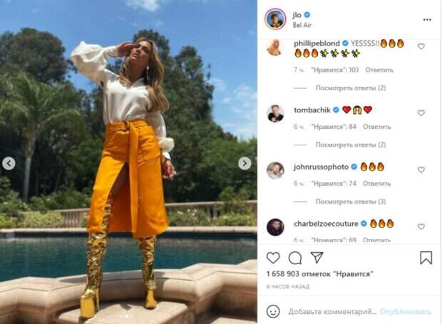 Чтобы напомнить о себе новым образом, Лопес недавно также опубликовала серию кадров из новой съемки. Дженнифер, которой через месяц исполнится 52-года, примерила модный образ львицы. Массивные золотые ботфорты, оранжевая юбка с огромным разрезом посередине и белая блуза создали весьма экстравагантный лук. Причем благодаря правильному уходу за собой Лопес в очередной раз подчеркнула молодой вид: «Эти сапоги!
