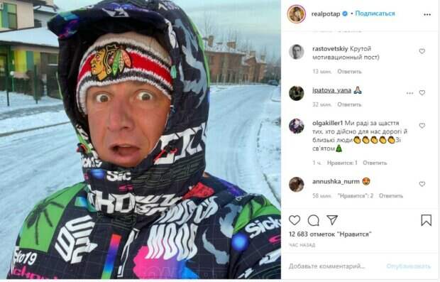Популярный украинский певец и продюсер Алексей Потапенко поделился забавным селфи с прогулки Артист решил поделиться новым селфи, сделанным во время прогулки на улице. Гуляя на морозе по Киеву, артист хорошо утеплился, чем умилил поклонников. Еще два дня назад артист наслаждался жарким отпуском на Мальдивах, расхаживая в одних пляжных шортах.