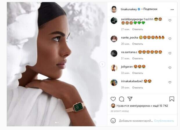 На новом фото Кунаки показалась среди нескольких скульптур. Красотка обняла одну из них, показывая лицо в профиль. На руке у Тины можно заметить часы. На второй фотографии девушка уже показалась более крупным планом и можно увидеть, что на ней было белое платье, а часы на руке сменились. Фанаты поставили тысячи лайков и написали комментарии: "Нет слов", "Ты самые захватывающая, что я когда-либо видел", "Я так сильно тебя люблю, сэр ... Я самый большой поклонник тебя", "Самый милый профиль на свете", "Удивительно, я такой фанат", "Оооо ... мило .... смотри", "красивый образ и какие шикарные часы", "Почти как Моника Беллуччи", "Представьте себе такое лицо", "Ты такая красивая". Напомним, молодая жена Венсана Касселя кардинально изменила имидж после поездки в Киев А еще Politeka сообщала, что молодая жена Венсана Касселя удивила своим неожиданным появлением в Киеве Также Politeka писала, что молодая жена Венсана Касселя на пляже задала тренд зеленым мини-бикини