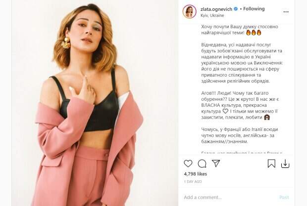 Звезда "Евровидения-2013" Злата Огневич высказалась о новом языковом законе, который вызвал ажиотаж в Украине Как передает Politeka.net, знаменитость посвятила этой проблеме новый пост на своей странице в соцсети "Инстаграм", который сопроводила пикантным фото. Она предстала перед поклонниками в розовом брючном костюме и коротком черном топе, образ дополнил яркий макияж с разноцветными тенями, белоснежным маникюр и золотые серьги.