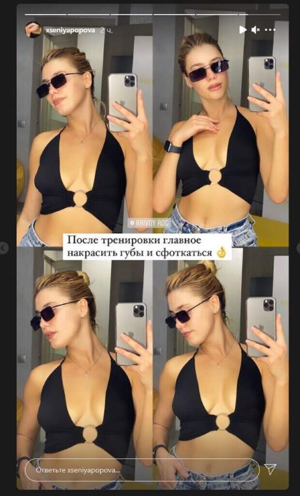 Как можно заметить, Ксения активно следит за своей фигурой и частенько в блоге можно увидеть фотографии и видео тренировок. В этот раз Попова не показывала процесс занятий, а уже только результат. На фото девушка была в стильном топе, очках и джинсах, а на руке можно увидеть фитнес-часы. Красотка стояла у зеркала, снимая себя на телефон. Ксения опубликовала сразу четыре фото, чтобы показать свою фигуру. "После тренировки главное накрасить губы и сфоткаться", - написала Попова. Напомним, звезду «Х-Фактора» и новой «ВИА Гры» подвесили за ноги к потолку ради красивой фигуры А еще Politeka писала, что звезда "Х-Фактора" и новой "ВИА Гры" неожиданно появилась в компании Валерия Меладзе Также Politeka сообщала, что звезда "Х-Фактора" и новой "ВИА Гры" в прозрачной блузе дала насладиться своей безупречностью