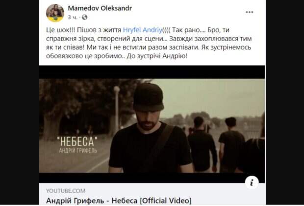 .. Бро, ты настоящая звезда, созданный для сцены... Всегда восхищался тем, как ты пел! Мы так и не успели вместе спеть. Как встретимся, обязательно это сделаем... До встречи, Андрей!" - написал Александр Мамедов. В июне ему исполнилось 36 лет. Андрей Грифель был женат, воспитывал троих детей - двух дочек и сына. Как сообщает РБК Украина, точная причина смерти музыканта неизвестна. Говорят, что Андрей "играл в футбол и просто упал". Андрей был основателем и лидером львовской piano-post-pop rock группы PROVIDER. Также известен по участию в популярной команде D.WORSHIP. В 2018 году стал участником христианского музыкального проекта прославления WHOLEHEART. Украинцы в сети сочувствуют семье певца и пишут слова утешения: "Просто шокуючий шок...", "Андрей... Хороший человек и крутой музыкант. Память", "Сердечно сочувствую... Пусть Бог облегчит боль утраты и даст силы пройти через все трудности...". Напомним, что скончался известный советский актер, на его фильмах выросли поколения. Как сообщала Politeka, остановилось сердце Народного артиста Украины, что произошло. Также Politeka писала, что в больнице умерла известная певица, врачи не смогли спасти.
