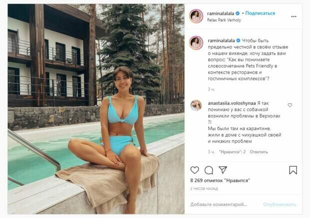 Об этом пишет Politeka.net со ссылкой на страничку знаменитости. "Чтобы быть предельно честной в своем отзыве о нашем викенде, хочу задать вам вопрос: “Как вы понимаете словосочетание Pets Friendly в контексте ресторанов и гостиничных комплексов”?", - написала под фотографией девушка. Фанаты поставили почти 10 тысяч лайков и написали комментарии: "Господи, где ты берешь такие купальники, это просто жесть, как у бабушки", "Имхо, это не совсем хорошо, особенно про отели, не совсем гигиенично", "Пипец, каким больным надо быть, чтобы везде таскать свое животное 24/7", "Очень красивый купальник и вы прекрасны в нем!", "главное, что тема красивого тела раскрыта". Сообщалось, что бывшая возлюбленная украинского певца Виталия Козловского устроила пикантную фотосессию и показала ее в сети. Рамина нарядилась в черный комплект нижнего белья, а поверх него набросила светлый лаковый плащ, расстегнув верхние пуговицы. Напомним, Виталий Козловский в туалете взбудоражил странной фотосессией и откровением А еще Politeka писала, что экс-невеста Козловского соблазнила аппетитными прелестями в леопардовом бикини Также Politeka сообщала, что беда случилась у экс-невесты Козловского, срочно нужна помощь