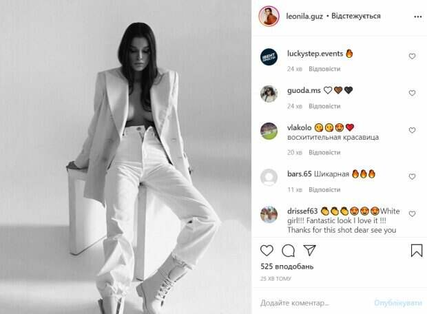 Об этом пишет Politeka.net со ссылкой на страничку знаменитости. Фанаты поставили больше тысячи лайков и написали комментарии: "Прекрасно", "Идеально", "Девушка, я всю дорогу Вами любуюсь. Увидел и про все свои проблемы забыл, хочу Вас за это поблагодарить", "«В ее глазах была сила сердца. »- Шарль Бодлер", "Прекрасная бабочка", "Очаровательная!", "Такая детка", "Твои глаза такие завораживающие, просто красивые", "В ее ангельских глазах немного дьявола. Она немного рай с дикой стороной", "Здравствуйте, выглядите очаровательно". Сообщалось, что модель Леонила Гузь, которая завоевала титул "Мисс Украина 2018", соблазнила видом в пиджаке на голое тело. Гузь была одета в белые джинсы, которые она игриво расстегнула на поясе. Джинсы были заправлены в грубые ботинки, которые добавили образу особого шарма. Сверху на Гузь был надет пиджак, который едва прикрыл обнаженную грудь красотки. Напомним, Мисс Украина Леонила Гузь прикрылась прозрачными простынями, воплощая самые сокровенные мечты А еще Politeka писала, что "Мисс Украина" Леонила Гузь поманила к себе чувственным взглядом Также Politeka сообщала, что Мисс Украина Леонила Гузь в платье без белья соблазнила взглядом