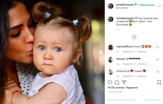 Накануне семья отпраздновала ее первый день рождения, а сейчас Димопулос решила поделиться памятными фото, которые семья успела сделать с девочкой за прошедший год. На снимках малышка сидит на руках у своих родителей, которые трогательно прижимают ее к себе и целуют. Судя по фото, девочка очень похожа на своего отца. «Наш первый день рождения. Моя София – моя Вселенная», - подписала фото счастливая мама. Поклонники Санты не смогли пройти мимо душевных снимков. «До чего же сладкая малышка!», «Боже, какая смешная одно лицо папа», «Какая лапочка. Мамина копия», «Маленькая копия папы!», «Какая булочка сладкая. Папина», «Невероятная девочка, голубоглазая принцесса!!», «Чудесная девочка!!! С днём рождения», «Не возможно не влюбится в вашу принцессу», - пишут люди. До этого мы писали, что Санта показала подросшую дочь, которой исполнился годик. Малышка позировала на стуле в окружении шариков и цветов. Молодая мама выбрала для Софии нежное бархатное платье с черным бантиком на шее. В посте, показав еще несколько фото, артистка вспомнила, что дочь появилась на свет с улыбкой. Напомним, звезда "Танців з зірками" Димопулос показала подросшую красотку-дочь. Как сообщала Politeka, звезда "Танців з зірками" Санта Димопулос показала, на что способна на паркете. Также Politeka писала, что Димопулос из «Танців з зірками» поразила выходкой в образе развратной монашки.