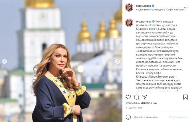 В День Киева народная артистка решила рассказать поклонникам о своем первом визите в столицу. Как ив дно, Ольга выложила яркие снимки на улицах городах, на которых появилась в элегантном образе. На прогулку звезда вышла в изысканной желтой вышиванке, поверх которой накинула темно-синюю кофту. Ее волосы распущены и красиво уложены, а на лице яркий макияж. В подписи к фотографиям Сумская рассказала свою историю: "Когда впервые приехала из Полтавы к сестре в Киев, мне было 14. Тогда я была приглашена на кинопробы к известному режиссеру. Киностудия им. Довженко, народные артисты в гримерных, в кулуарах увидела легендарных И. Миколайчука, И. Гаврилюка, А. Роговцева. Я была поражена насыщенным творческой жизнью студии! В каждом павильоне кипела работа, шли съемки. После проб мы поехали на экскурсию по Киеву, я впервые увидела вживую величие и красоту Софии Киевской, Лавры, Золотых ворот! Влюбилась в столицу навсегда и то почувствовала тогда, что буду жить именно в этом невероятно красивом городе, показалось мне родным. Так и случилось. Кстати, на роль меня тогда так и не утвердили, но в кино я попала чуть позже, но это уже другая история! С днем Киева, друзья!". Напомним, Сумская полезла с поцелуями к самой богатой певице Украины и ее мужу-миллиардеру, кадры: "Можно к вам? ". Как сообщала Politeka, 54-летняя Сумская ошеломила цветущей красотой на встрече с фотографом: повезло Борисюку. Также Politeka писала, Дочь Сумской Антонина Паперная удивила откровением об отношениях с матерью: "Не поняла, как можно…".