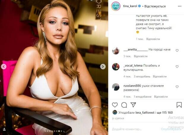 Кроме того, певица удивляла украинцев элегантным белоснежным нарядом с открытой спиной, дополнив образ соблазнительным взглядом и прической. Не менее ярким был образ Тины Кароль, когда певица нарядилась в крохотный наряд без штанов, позируя при этом на лавочке. Особенно сильно украинцам понравился счастливый взгляд кумира, о чем свидетельствует происходящее в комментариях. Один из них написал "Ауф, какая волчица". До этого мы рассказывали, что украинская певица Тина Кароль превзошла саму себя в откровенности нарядов Знаменитость выложила на своей странице в соцсети "Инстаграм" cерию фото в новом образе, на этот раз она предстала в длинном черном платье необычного фасона. Нижняя часть наряда представляет из себя юбку, обтягивающую бедра, а верхняя состоит из двух сегментов: на животе и груди. Платье обнажило талию и бока исполнительницы, можно заметить, что на ней нет бюстгальтера. Тина Кароль также надела длинные кожаные перчатки во всю руку. Напомним, счастливая Кароль получила любовное признание от известного красавца Как сообщала Politeka, Тина Кароль и Дан Балан скоро воссоединятся Также Politeka писала, что Кароль едва вместила декольте в бесстыжее платье