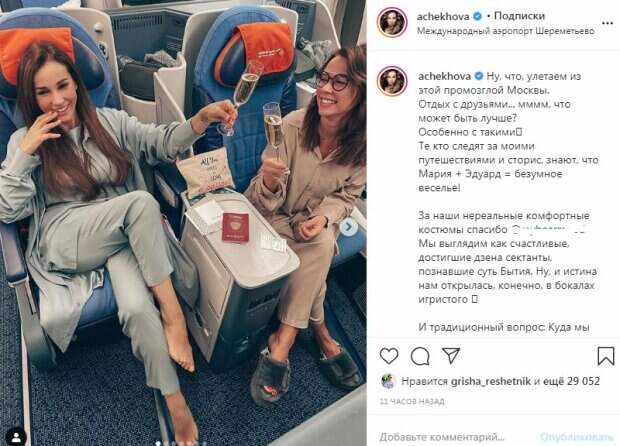 Примечательно, что Чехова с подругой были в пижамах и с бокалами шампанского. Сначала обе позировали в мягких креслах, а позже стояли с Эдуардом возле табло. "Ну, что, улетаем из этой промозглой Москвы. Отдых с друзьями... мммм, что может быть лучше? Особенно с такими