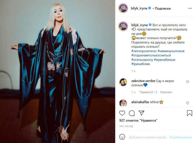 Также Билык признавалась, что этим летом не летала никуда отдыхать из-за постоянной работы. Как пишет Politeka.net, в новом посте на своей странице в Инстаграм певица поделилась своими сожалениями о прошедшем лете. «Вот и пролетело лето. Представляете, ещё не отдыхала ни дня. Может осенью получится? Поделитесь-ка друзья, где любите отдыхать осенью?», - написала Билык. Она также поделилась снимком, на котором показала поближе один из своих концертных образов. Певица была одета в темно-синий наряд, напоминающий японское кимоно. На нем были вышиты бледно-розовые журавли, что добавляло образу звезды необычной изюминки. Поклонники Билык тут же принялись комментировать публикацию. «Невероятная красавица очень красивые длинные белые волосы круто крутая блондинка», «Как можно работать все лето, не отдыхая», «Очень красивая и талантливая Женщина!», «Ира, Вы как всегда на высоте», - пишут люди. Напомним, Ирина Билык рассказала, как ее песни оказались у экс-мужа Пугачевой Киркорова. Как сообщала Politeka, Билык со слезами на глазах сделала печальное признание после нового развода. Также Politeka писала, что Билык в кожаных ботфортах устроила настоящую жару на сцене, эффектные кадры.