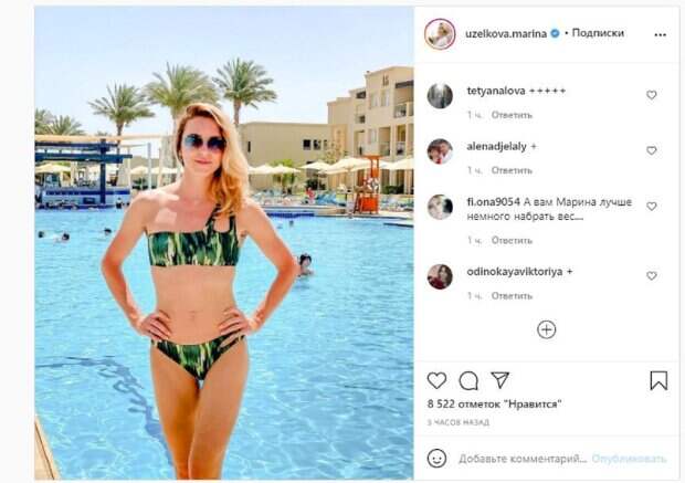В этот раз Марина решила показать на своем примере, как выглядит идеальная фигура. Красотка показалась в мини-купальнике, позируя на фоне бассейна, а образ дополнила стильными очками. Фанаты поставили более 8 тысяч лайков и написали комментарии: "Нет, у тебя все прекрасно", "Красотка", "Выглядите прекрасно", "Красоточка", "Какая стройная", "Круто, и мы восхищены вами", "Подскажите, как потолстеть?", "А вам, Марина, лучше набрать немного вес", "Интересно", "Шикарные ноги, Марина", "Какая вы красивая, Марина", "Прекрасно выглядишь ! Молодец! Ты трудяшка !". Мы писали, что фитнес-тренер Марина Боржемская показала подросших детей. В этот раз Марина опубликовала фото, где позировала вместе с детьми. Все трое улыбались, лежа на шезлонге. Как можно понять, Боржемская улетела на море с детьми. Напомним, тренер "Зважені та щасливі" Боржемская поделилась секретом красивых рук А еще Politeka писала, что тренер "Зважені та щасливі" Боржемская показала, как подготовилась к пляжному сезону Также Politeka сообщала, что экс-жена Узелкова раскрыла, как избавится от крепатуры