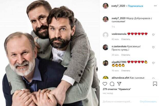Так, на снимке все трое мужчин позируют в стильных костюмах. При этом Добронравов со смехом держит на спине сыновей, которые повисли, схватившись за его плечи. «Фёдор Добронравов с сыновьями!», - говорится в подписи к фото. Стоит отметить, что Виктор и Иван решили пойти по стопам отца и также стали актерами. У них обоих успел накопиться внушительный послужной список ролей в фильмах, сериалах и театральных постановках. Поклонники «Сватов» оценили фото артистов по достоинству. «Красавцы! Просто супер!», «Как сыновья похожи на своего отца! Желаю всем здоровья и успехов их нелёгком труде!», - пишут в комментариях. Напомним, ранее актриса Татьяна Кравченко рассказала, как актер Федор Добронравов повлиял на ее жизнь. По словам актрисы, она иногда сомневается правильности выбора жизненного пути. И если бы не Федор Добронравов, то неизвестно, к чему бы такие мысли артистки привели. «…однажды Фёдор Добронравов приехал на площадку сериала «Сваты», светясь от счастья: «Нет, Танюх, неплохим мы все-таки делом занимаемся! Представляешь, сын моих знакомых, у которого лейкемия, взял с собой в израильскую клинику диски с записью наших «Сватов». Так тамошние доктора обалдели: как только мальчишка посмотрит несколько серий — у него показатели крови улучшаются! », - с улыбкой вспоминала актриса. Напомним, Валюха из "Сватов" нежно прижалась к Федору Добронравову, чувств не скрыть. Как сообщала Politeka, счастливая Валюха из «Сватов» расцвела в объятиях звездного «мужа», фото. Также Politeka писала, что Валюха из "Сватов" напугала траурным видом, неожиданное фото: "Дай бог...".
