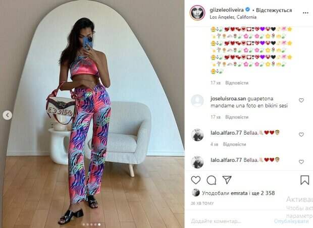 Модель Жизель Оливейра из модного дома Victoria’s Secret впечатлило безупречной фигурой, пошалив перед зеркалом Как сообщает Politeka, кадрами знаменитость поделилась у себя в Instagram. Так, знаменитость позирует в облегающем топе без белья, безупречно изгибаясь перед камерой. Примечательно, что образ красотка дополнила элегантной сумочкой и шлепками.