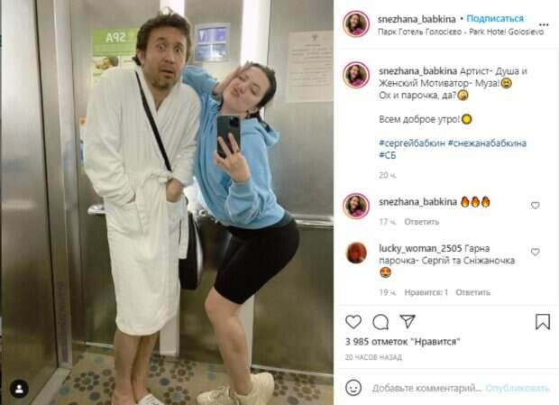 Супруга музыканта Сергея Бабкина, Снежана, изумила дерзкой выходкой Как передает Politeka.net, 35-летняя девушка опубликовала свежее фото в своем микроблоге в Инстаграм, которым позабавила публику. Снежана и ее супруг позировали в лифте. Снежана в обтягивающих трениках и голубом худи облоктилась на плечо супруга, довольно дерзко выпятив упругие ягодицы.