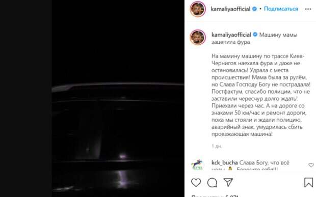 Камалия рассказала, что с ее мамой все в порядке, она не пострадала. Виновник ДТП повредил машину и просто скрылся с места происшествия. "На мамину машину по трассе Киев - Чернигов наехала фура и даже не остановилась! Удрала с места происшествия! Мама была за рулем, но, слава Господу Богу, не пострадала!" - рассказала певица. Камалия поблагодарила полицейских за то, что "не заставили чересчур долго ждать". Певица и ее мама также предполагают, что водители грузовиков из-за напряженного графика часто превышают скорость, чтобы успеть доставить товар. При этом она вспомнила, что на рейсы в Европе отправляют двоих водителей, чтобы они менялись в дороге и смогли отдохнуть. Напомним, самая богатая певица Украины похвасталась дорогостоящим хобби, фото. Как Politeka сообщала, что самая богатая певица Украины покинула страну, обратившись к украинцам. Также Politeka писала, что самая богатая певица Украины решила показать свои умения на соревнованиях, видео.