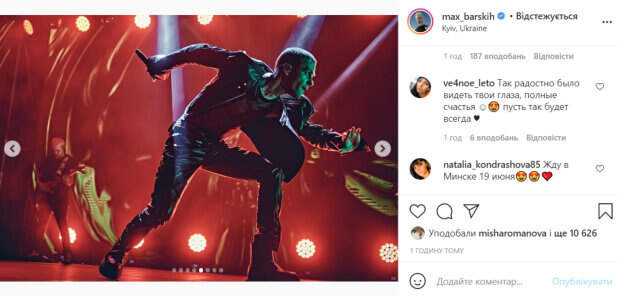 Он был одет в прозрачную майку, поверх которой набросил кожаную куртку. Певец не сдержал эмоций и поблагодарил поклонников, которые разделили с ним вечер. «Ребята, вчера был офигенный концерт! Мы обязательно ещё увидимся в Киеве! Следите за анонсами», - написал артист. В комментариях счастливые фанаты оставили артисту массу приятных отзывов. «Макс, спасибо тебе за праздник, который ты даришь людям, концерт бомбический, энергетика потрясающая», «Макс, это было незабываемо такое счастье быть на твоих концертах», «Так радостно было видеть твои глаза, полные счастья. Пусть так будет всегда», - пишут пользователи сети. Ранее мы писали, что Макс Барских после яркого концерта в Турции решил отдохнуть на пляже. Артист снял сторис, лежа на шезлонге. Рядом с ним засветились четыре молодые девушки в купальниках. Компании было очень весело и они решили хором пропеть шуточную песню про Пасху. Напомним, что Барских заговорил о переезде из Украины, поклонники поддержали: «Макс, дерзай!». Как сообщала Politeka, Макс Барских заткнул за пояс коллег, отпраздновав успех с размахом: «Приятно удивлен…». Также Politeka писала, что Макс Барских удивил новой внешностью, первые кадры преображения: "Минус 10 лет".