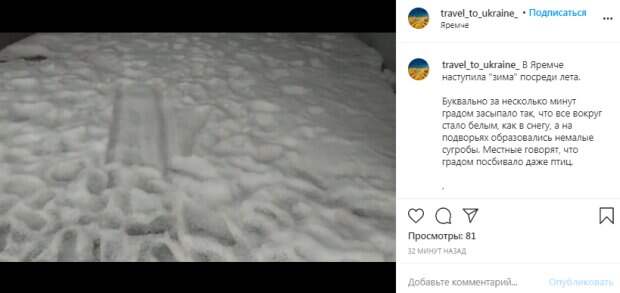 Женщина на видео стала загребать руками снег, показывая его на камеру. «В Яремче наступила "зима" посреди лета. Буквально за несколько минут градом засыпало так, что все вокруг стало белым, как в снегу, а на подворьях образовались немалые сугробы. Местные говорят, что градом посбивало даже птиц», - отмечается в сообщении. Еще одни пользователи сети отметили, что аномалия наблюдалась именно в Яремче. А вот в Буковели ничего такого не было. «Буковель - солнце, Яремче солнце, а на выезде хоть лыжный сезон открывай», - пишут люди. Стоит отметить, что на Западной Украине, особенно в горах, достаточно часто выпадает снег в самое неподходящее для этого время. Обычно жителей Ивано-Франковской области тяжело удивить природными катаклизмами, но сегодняшний град смог это сделать. Кстати, не так давно в селе Овлочин (Волынская область) выпал очень крупный град, который уничтожил часть урожая. Напомним, что Днепр кишит медузами, аномалия разгадана: "Когда жалят - впрыскивают...". А еще Politeka писала, что двойной смерч пронесся вблизи популярного украинского курорта: впечатляющие кадры. Также Politeka сообщала, что природа натворила беды на Одесчине: "Ущерб на миллиарды", о чем речь.