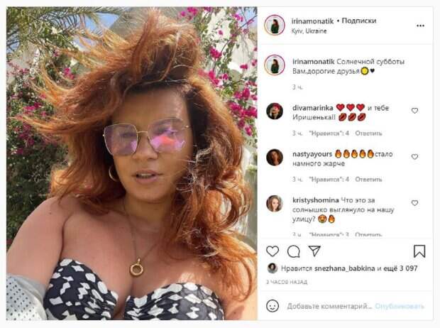 Но страничку жена Монатика в Инстаграм завела и даже собрала там почти 100 тысяч поклонников. Девушка решила показать себя в черно-белом мини-топе, нагнувшись над камерой так, чтобы показать лучший ракурс для заглядывания в декольте. Звезда дополнила образ стильными очками, а на шее можно заметить цепочку с кулоном. Волосы у Ирины были легонько растрепанными ветром, что добавило эффектности кадру. "Солнечной субботы Вам, дорогие друзья", - написала Ирина. Фанаты, включая Снежану Бабкину, поставили более 3 тысяч лайков и написали комментарии: "И тебе, Ирина", "Стало намного жарче", "Что это за солнышко выглянуло на нашу улицу?", "И вам прекрасного выходного дня", "Спасибо! Всем тепла и добра!", "У вас уже солнечная. Мы от вас подзарядимся", "Взаимно". Сообщалось, что ена популярного музыканта Димы Монатика Ирина потрясла красотой в платье с бахромой. На стоп-кадре звезда потрясла подолом во время пленительного танца, отчего бахрома красиво двигалась и притягивала взгляд. Напомним, аппетитная жена Монатика в кружевном белье разрешила посмотреть на свой ритуал А еще Politeka писала, что разомлевшая жена Монатика в постели впечатлила Дантеса Также Politeka сообщала, что горячая жена Монатика покорила легкостью, задрав роскошное платьице