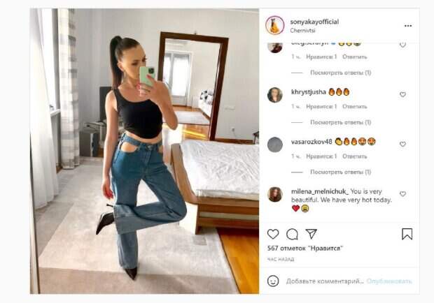 На новом фото, которое Соня опубликовала в Инстаграм, девушка позировала в стильном топе и штанах с вырезами. Девушка стояла перед зеркалом в спальне и снимала себя на телефон, задрав одну ножку. "Привет", - написала красотка под фото. Не смог пройти мимо фото и известный украинский телеведущий Олег Серафин, который поставил смайлики в виде огня. Фанаты поставили сотни лайков и написали комментарии: "Вы очень красивы. У нас сегодня очень жарко", "Огонь", "20 секунд назад опубликовала", "Невероятная красоточка. Счастья прекрасной девушке". Напомним, племянница Ротару заворожила формами в красном купальнике А еще Politeka писала, что племянница Ротару, выпятив пятую точку, мастерски оседлала надувной круг Также Politeka сообщала, что племянница Софии Ротару появилась в приспущенной рубашке среди ярких маков