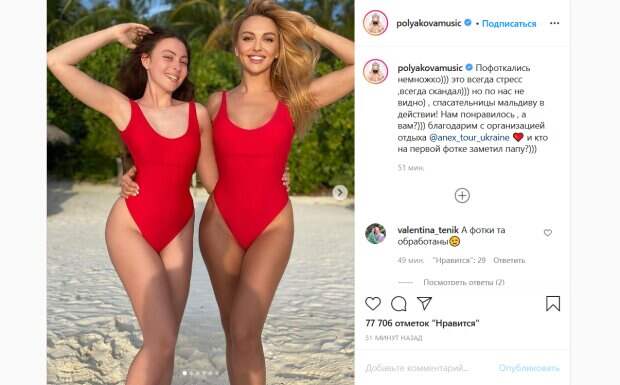 Красные наряды в стиле «Спасателей Малибу» идеально подчеркнули фигуры красоток. При этом купальник отличается довольно откровенным кроем трусов, максимально открывающим бедра. Мать и дочь старательно позируют перед камерами, демонстрируя свои пляжные фигуры. При этом подписчики Поляковой заметили на фото явные следы обработки. Об этом они написали в комментариях. «Пофоткались немножко))) это всегда стресс, всегда скандал))) Но по нас не видно, спасательницы Мальдиву в действии! Нам понравилось, а вам? И кто на первой фотке заметил папу?», - написала Полякова в подписи к фото. Ее подписчики активно комментируют пост звезды. «А фотки-то обработаны», «Так похожи», «Обалденные девчонки», «Просто красавицы! Нереалочки! Бомба!», «Класс, две невероятные принцессы», «Доця уже какая ноги от ушей, как и у мамы красотки», «Видно Фотошоп», «Доця уже маму перегнала», «Ох чувствую будет ваша Маруся крутить мужиками... Так хороша!», - пишут люди. Напомним, 15-летняя дочь Поляковой смутила видом, слишком натянув трусы купальника: «Господи, девочка, угомонись». Как сообщала Politeka, Полякова публично "заплевала" Тину Кароль, Лободу и Ани Лорак, скандальное видео: "Бесит меня...". Также Politeka писала, что Полякова в маленьком бикини выставила "располневшую" фигуру, Никитюк не смолчала: "Боже, какая. ..".