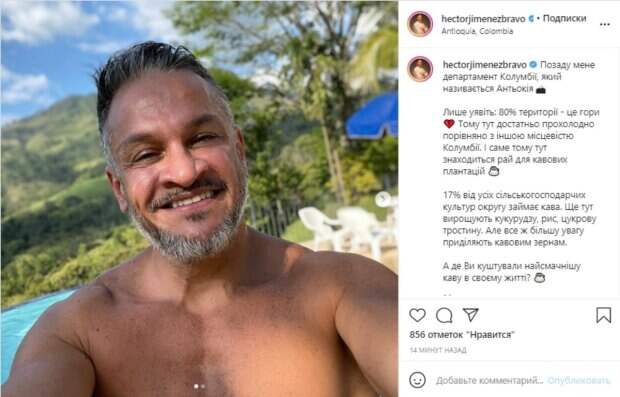 Звезда телеэкранов позировал на вилле в горах, расположившись рядом с бассейном. Как известно, сейчас знаменитость находится на своей Родине - Колумбии. По словам довольного Хименес-Браво, именно здесь выращивают самый вкусный кофе в мире. Шеф-повар заставил истекать слюнкой напоминанием о бодрящем ароматном напитке. "Позади меня департамент Колумбии, который называется Антьокия