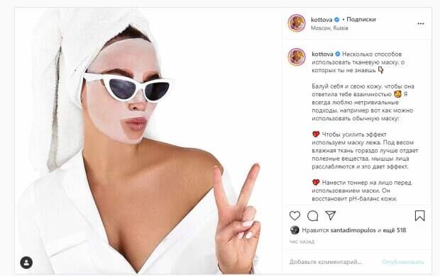 Об этом пишет Politeka.net со ссылкой на страничку знаменитости. "Несколько способов использовать тканевую маску, о которых ты не знаешь. Балуй себя и свою кожу, чтобы она ответила тебе взаимностью. Я всегда люблю нетривиальные подходы, например вот как можно использовать обычную маску", - написала Татьяна. Фанаты поставили более 500 лайков и написали комментарии: "Не знала, что можно в сауну брать маску, буду придерживаться ваших полезных советов", "Конечно же я люблю ухаживать за своей кожей, Также люблю маски", "Я предпочитаю наносить всегла маски утром, и желательно с холодным, бодрящим эффектом)", "Привет Коттова. Сижу на берегу моря, смотрю на твои фото и понимаю кого мне сейчас не хватает", "Бомбита", "Ох, какой ракурс". Сообщалось, что известная модель и певица Татьяна Котова показала себя в необычном ракурсе и рассказала о любви. На фото Котова позировала в блузке, которую завязала на узел на уровне бюста. Красотка, как оказалось, не очень любит носить белье, что сделало снимок очень горячим. Напомним, блондинка из "ВИА Гры" избавилась от трусиков, прикрыв срамоту арбузом А еще Politeka писала, что блондинка из "ВИА Гры" сразила наповал огромным декольте и разрезом Также Politeka сообщала, что жена Меладзе в розовом костюме ошарашила видом на публике, фото