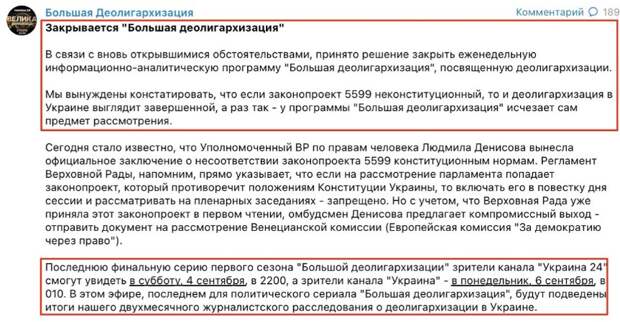 Телеканал Ахметова «Украина 24» выдал заявление на одном из своих Telegram-каналов под названием «Большая деолигархизация», в которой заявил о закрытии одноименной передачи. Можно было бы подумать неумелый хайп на сегодняшнем заявлении омбудсмена Денисовой. Слабо верится, что у Ахметова не захотят и дальше освещать эту историю с выгодными для олигарха акцентами.