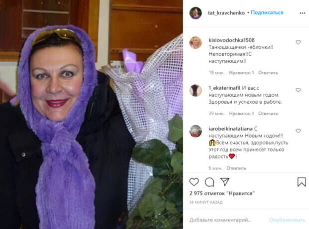 В руках актриса держала букет цветов. В глаза сразу же бросается ее яркий макияж: подведенные глазки, румяные щеки и алые губы - так и сверкает моложавым видом. Актриса одарила фанатов искренней улыбкой. "С наступающим Новым годом! ❤️
